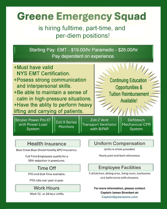 Applications are available for download below and can be returned by mail, in person or via email to captain@greeneems.com.